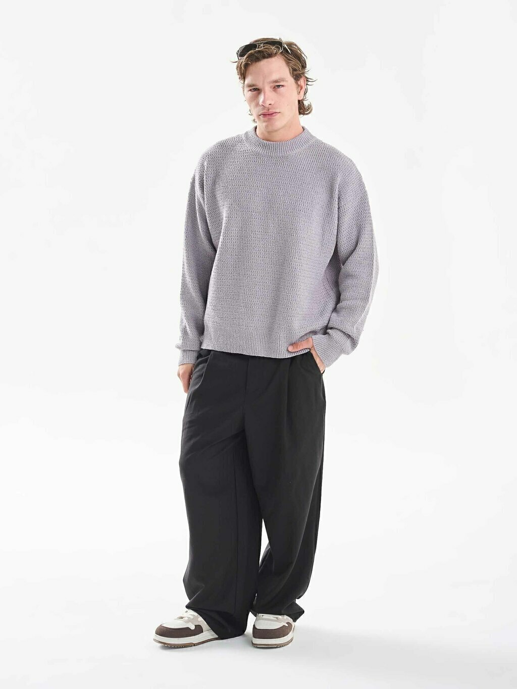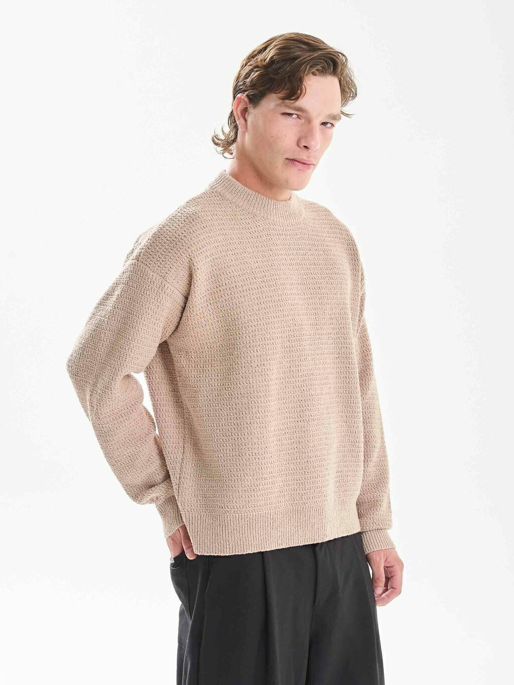 Confeccionado con un tejido tramado, destaca por su cuello redondo y hombro caído, ofreciendo un fit oversize que se adapta a cualquier figura.