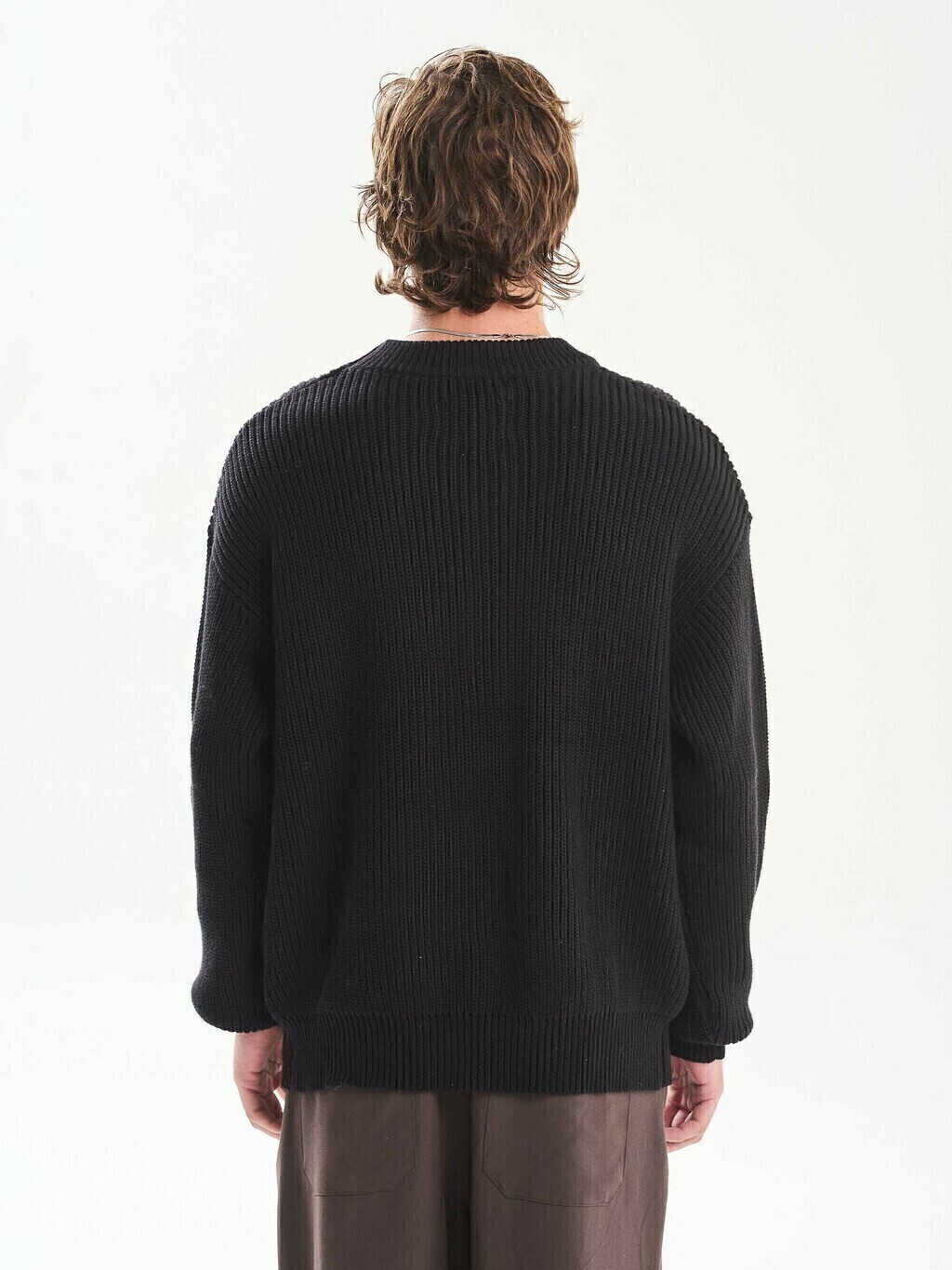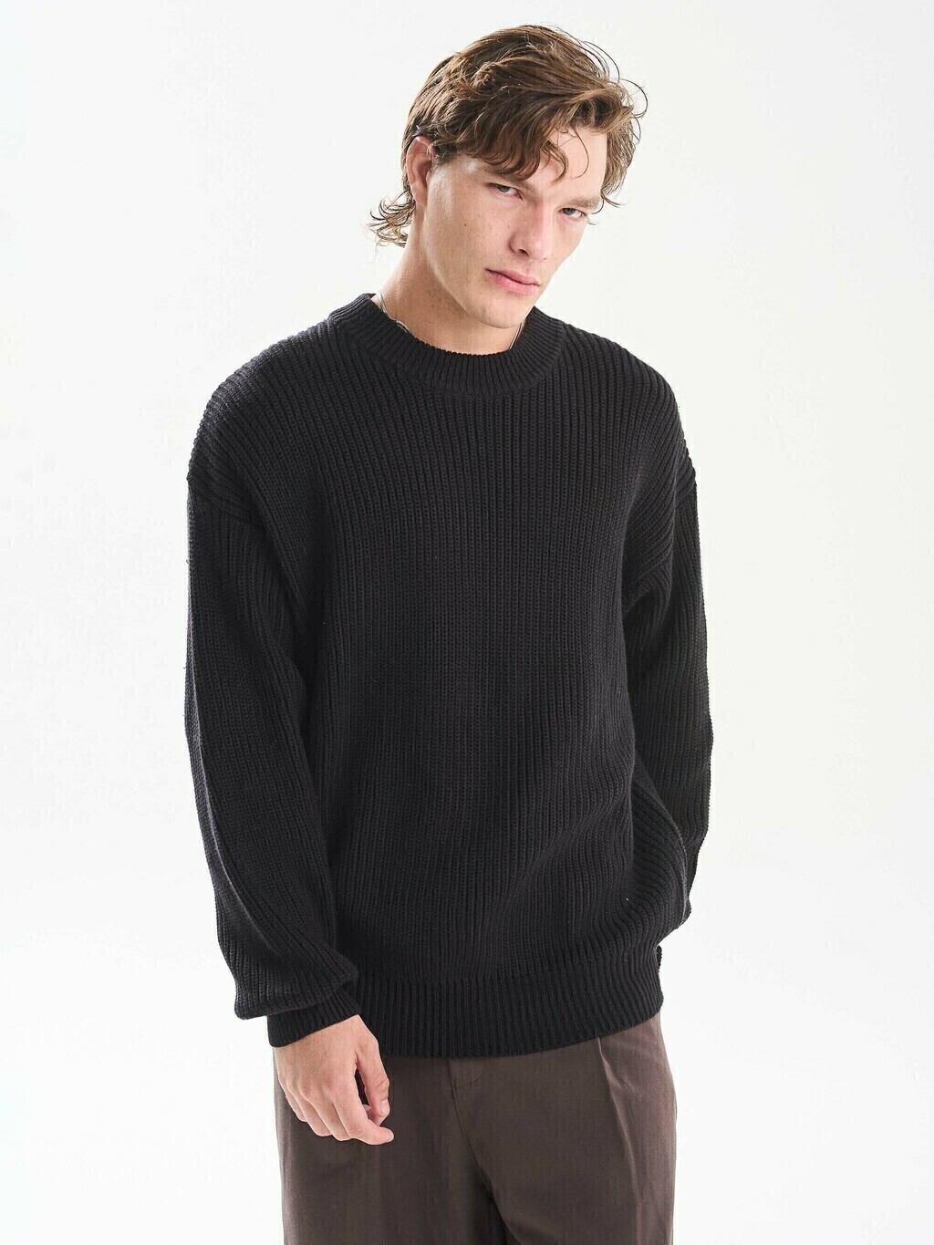 Sweater de punto inglés con cuello redondo. De textura definida y calce relajado, es una opción clásica y versátil para el uso diario.